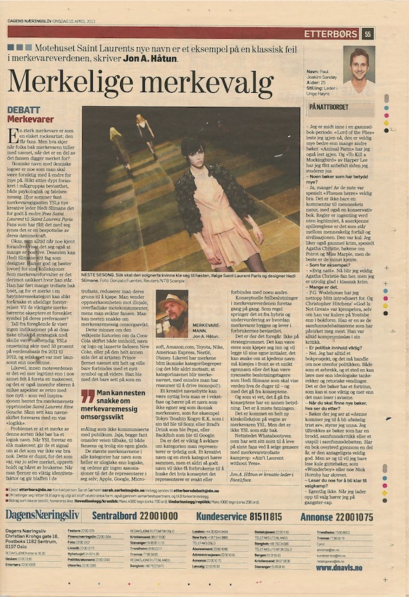 Creative Director Jon Håtun is in todays issue of DN published with a chronicle about strange choices for brands. He has specially looked into the design icon Saint Laurents recently change of name.